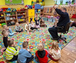 Dzielnicowy rozmawia z najmłodszymi o bezpieczeństwie podczas ferii