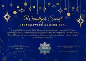 - Świąteczne życzenia Z okazji zbliżających się Świąt Bożego Narodzenia oraz Nowego Roku kierownictwo Komendy Powiatowej Policji w Bełchatowie z mł. insp. Przemysławem Gaworowskim na czele przekazuje serdeczne życzenia funkcjonariuszom i pracownikom Policji, ich rodzinom oraz wszystkim mieszkańcom powiatu bełchatowskiego. Niech świąteczny czas jak i Nowy Rok obfitują w zdrowie, wszelką pomyślność, radość, a życzliwość i miłość bliskich rozjaśniają każdy dzień.