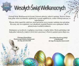 - Wielkanocne życzenia Z okazji nadchodzących Świąt Wielkanocnych Komendant Powiatowy Policji w Bełchatowie mł. insp. Przemysław Gaworowski oraz I Zastępca Komendanta mł. insp. Jarosław Słok składają najserdeczniejsze życzenia zdrowia, spokoju i radości. ,,Niech ten wyjątkowy czas, spędzony w gronie najbliższych, przyniesie wytchnienie, chwilę refleksji oraz radość płynącą z codziennych, lecz najcenniejszych momentów. Wiosna, która na dobre rozgościła się w naszej rzeczywistości, niech obdarzy Państwa nową energią, nadzieją i optymizmem. Życzymy, by ten czas odrodzenia był źródłem wewnętrznej harmonii oraz siły, potrzebnej do pokonywania wszelkich wyzwań. Z wyrazami wdzięczności za zaufanie, współpracę i troskę o wspólne dobro, życzymy, aby nadchodzące dni były pełne ciepła, bliskości i wzajemnej życzliwości".